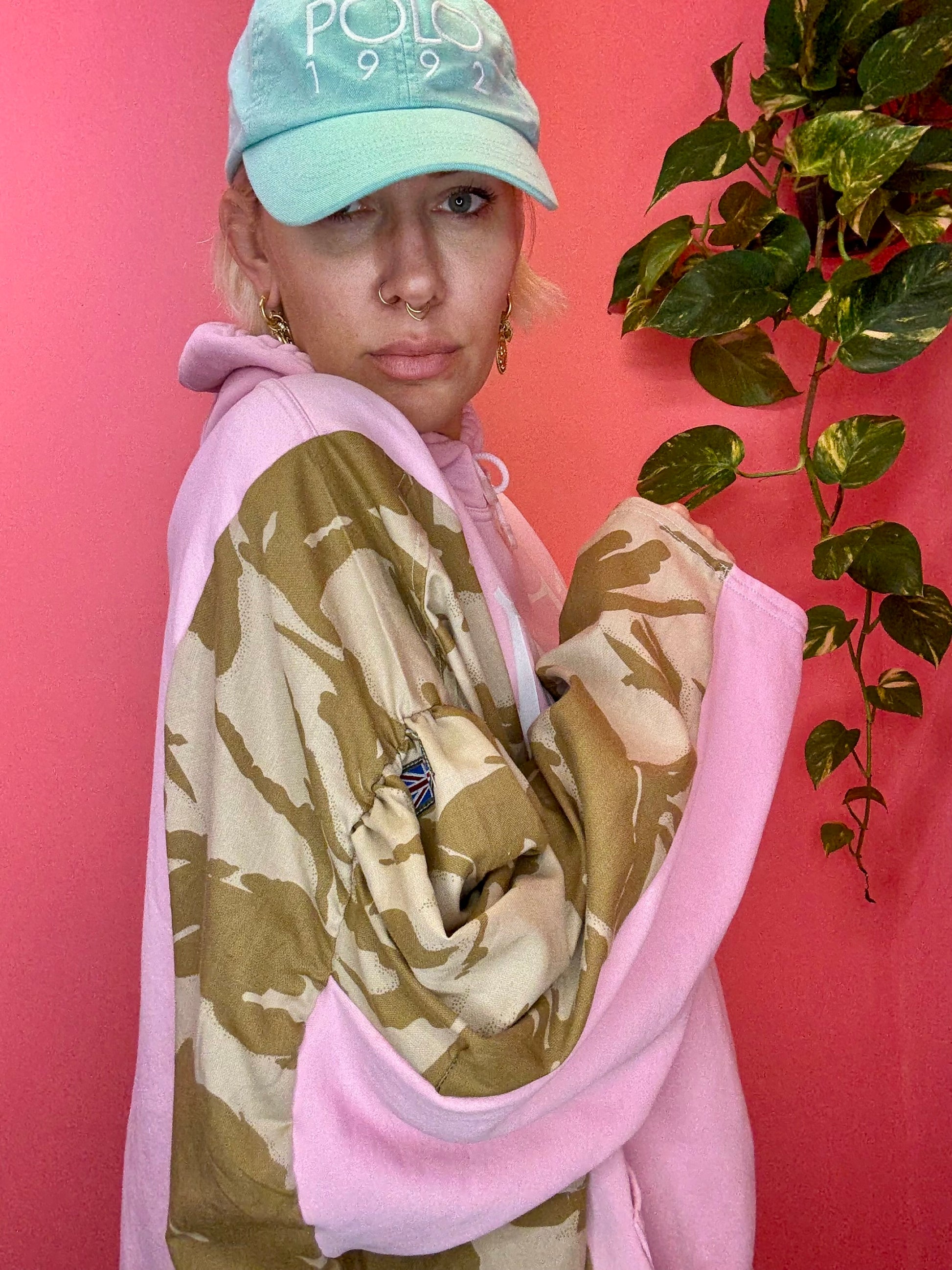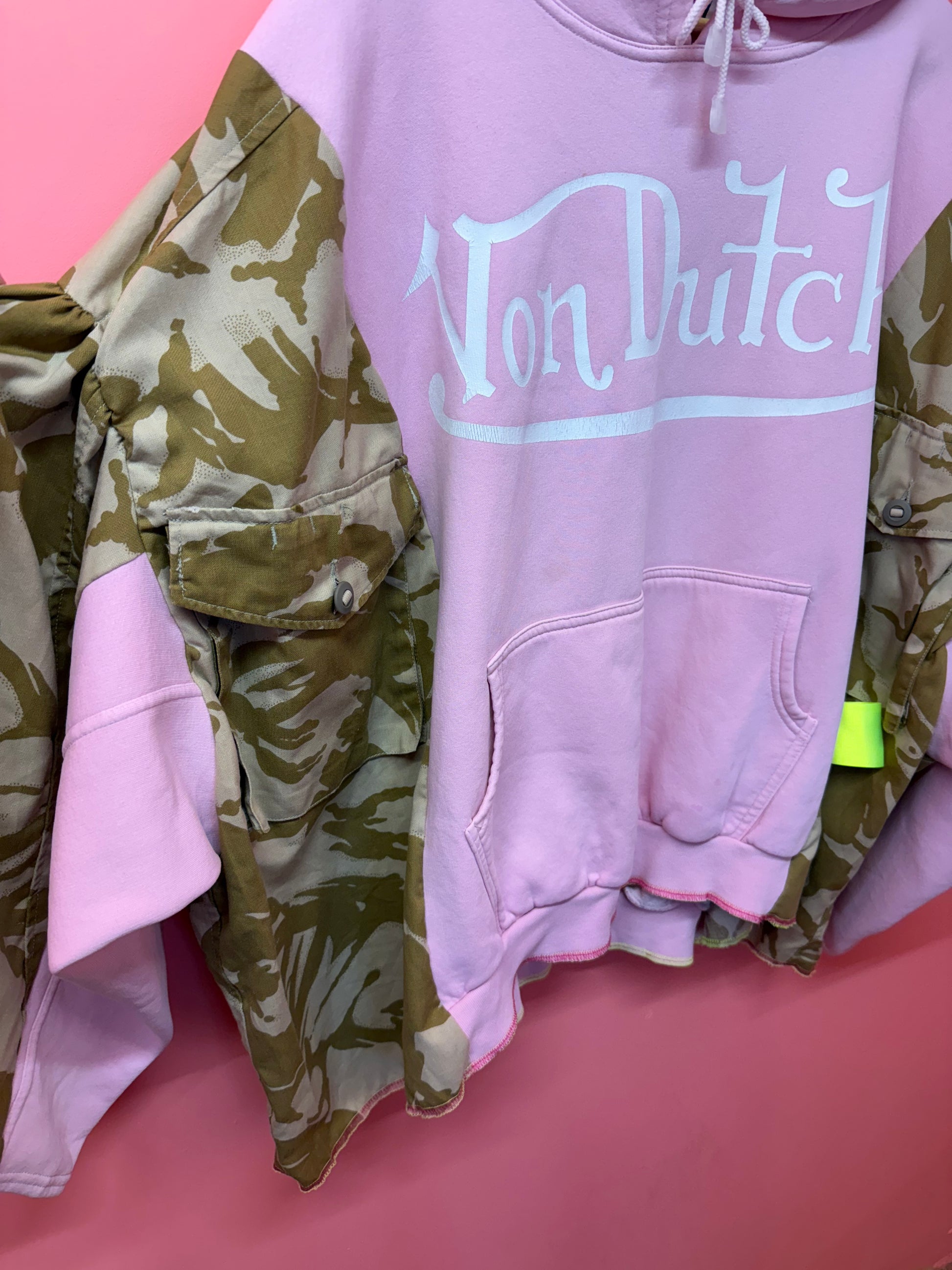 Work & Play is built from vintage workwear and camo jackets — each one completely taken apart, rebuilt, and fused with soft vintage sweatshirt fabric to create those signature balloon arms and gathered puff shoulders.