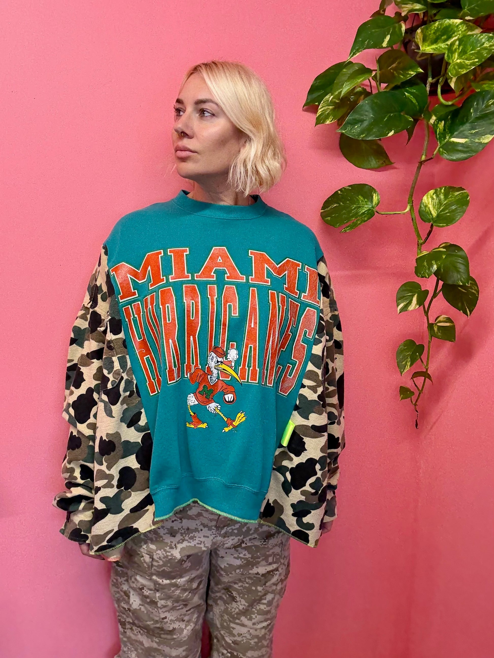 Reworked camo shirt super soft flannel fabric with a vintage Miami hurricane sweatshirt.
