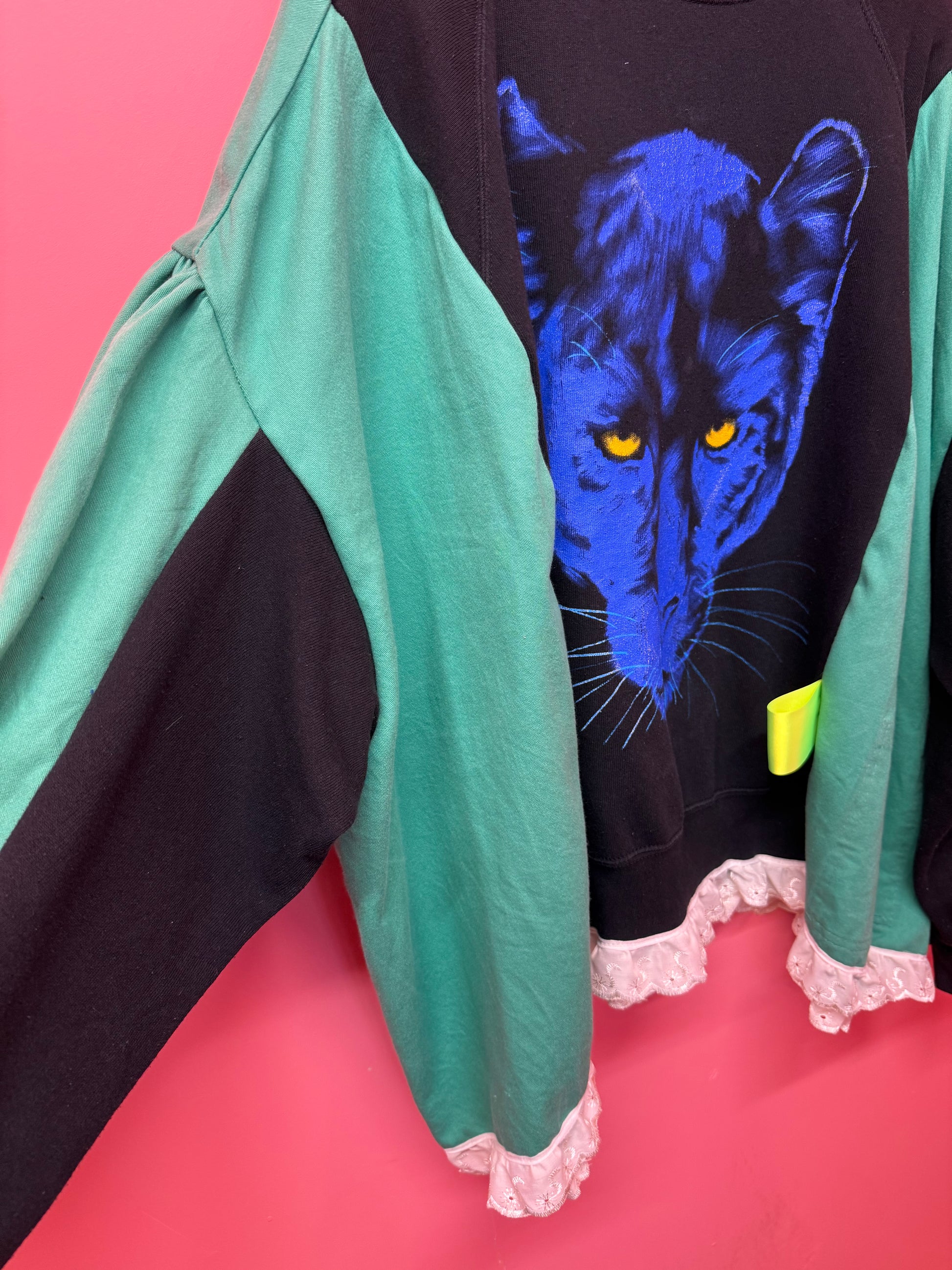 Work & Play is built from vintage workwear and camo jackets — each one completely taken apart, rebuilt, and fused with soft vintage sweatshirt fabric to create those signature balloon arms and gathered puff shoulders.