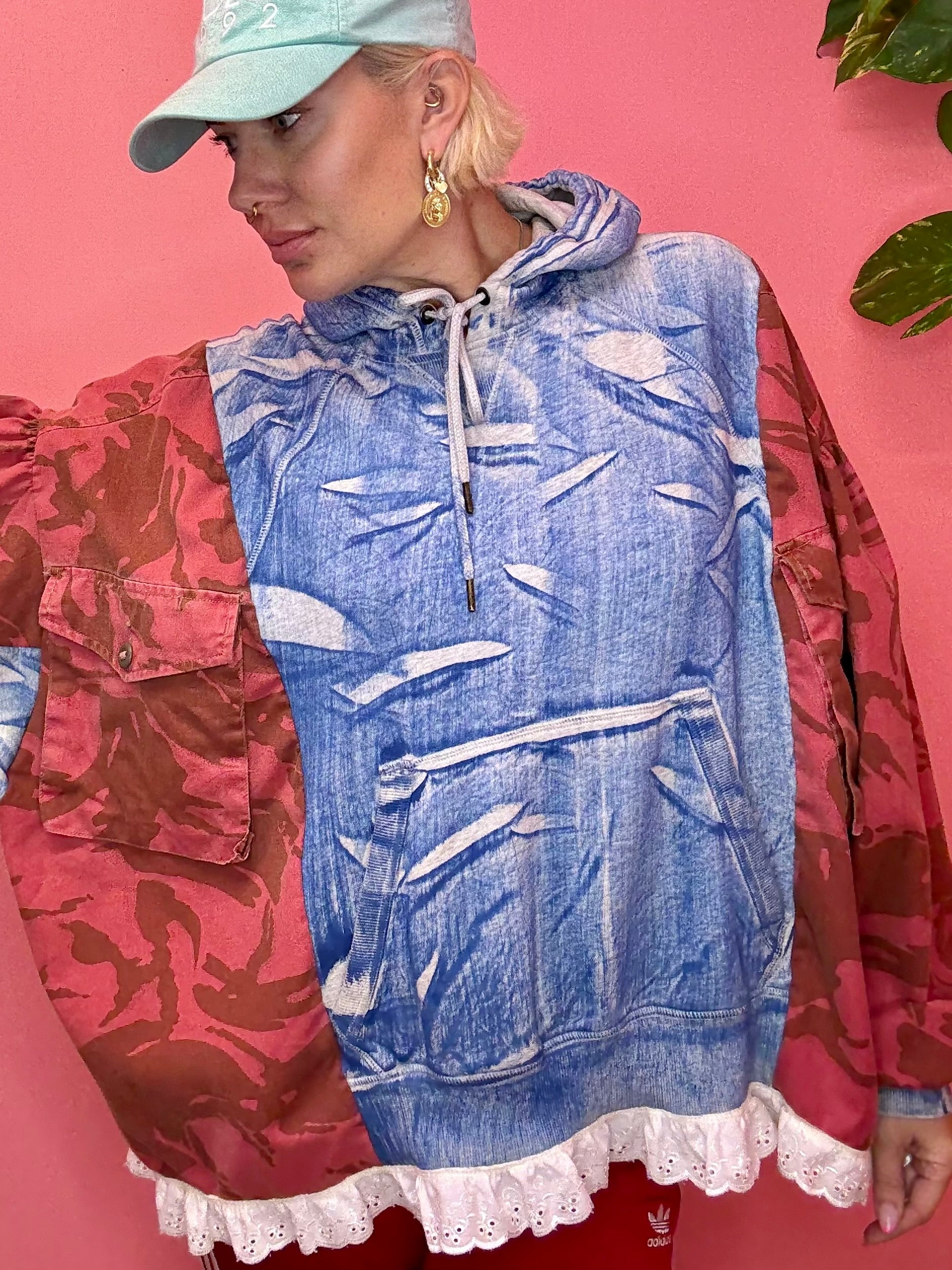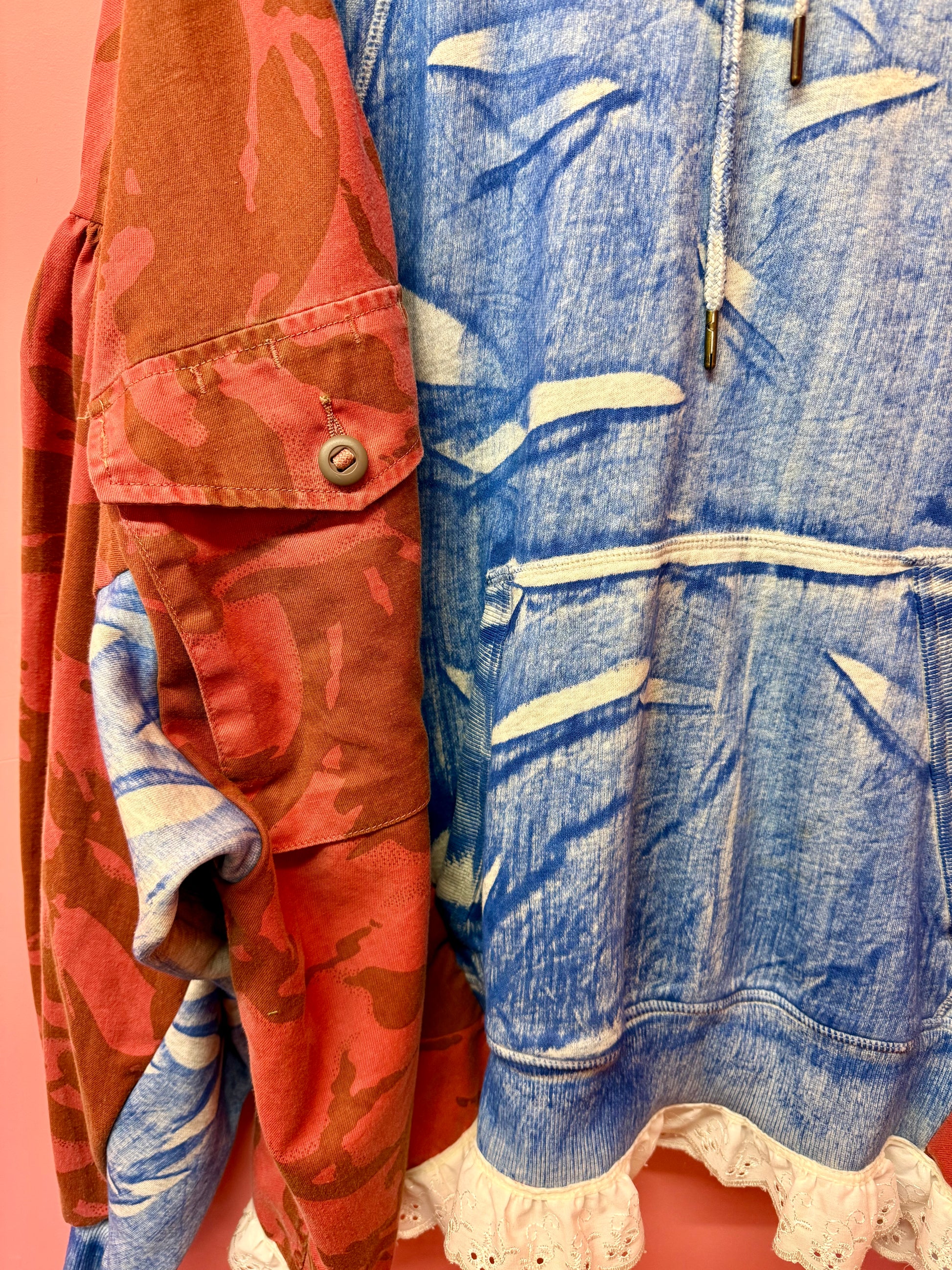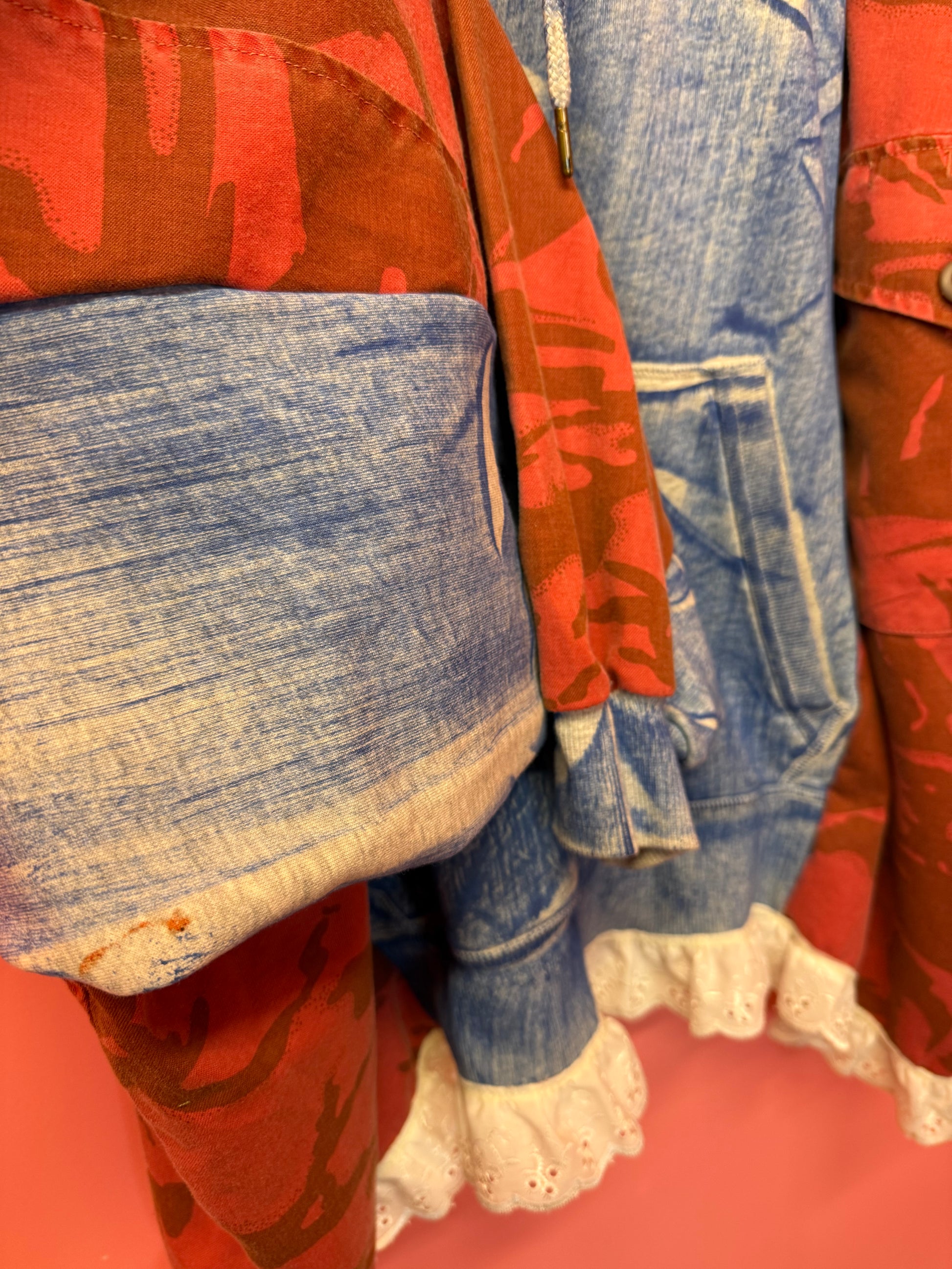 Work & Play is built from vintage workwear and camo jackets — each one completely taken apart, rebuilt, and fused with soft vintage sweatshirt fabric to create those signature balloon arms and gathered puff shoulders.