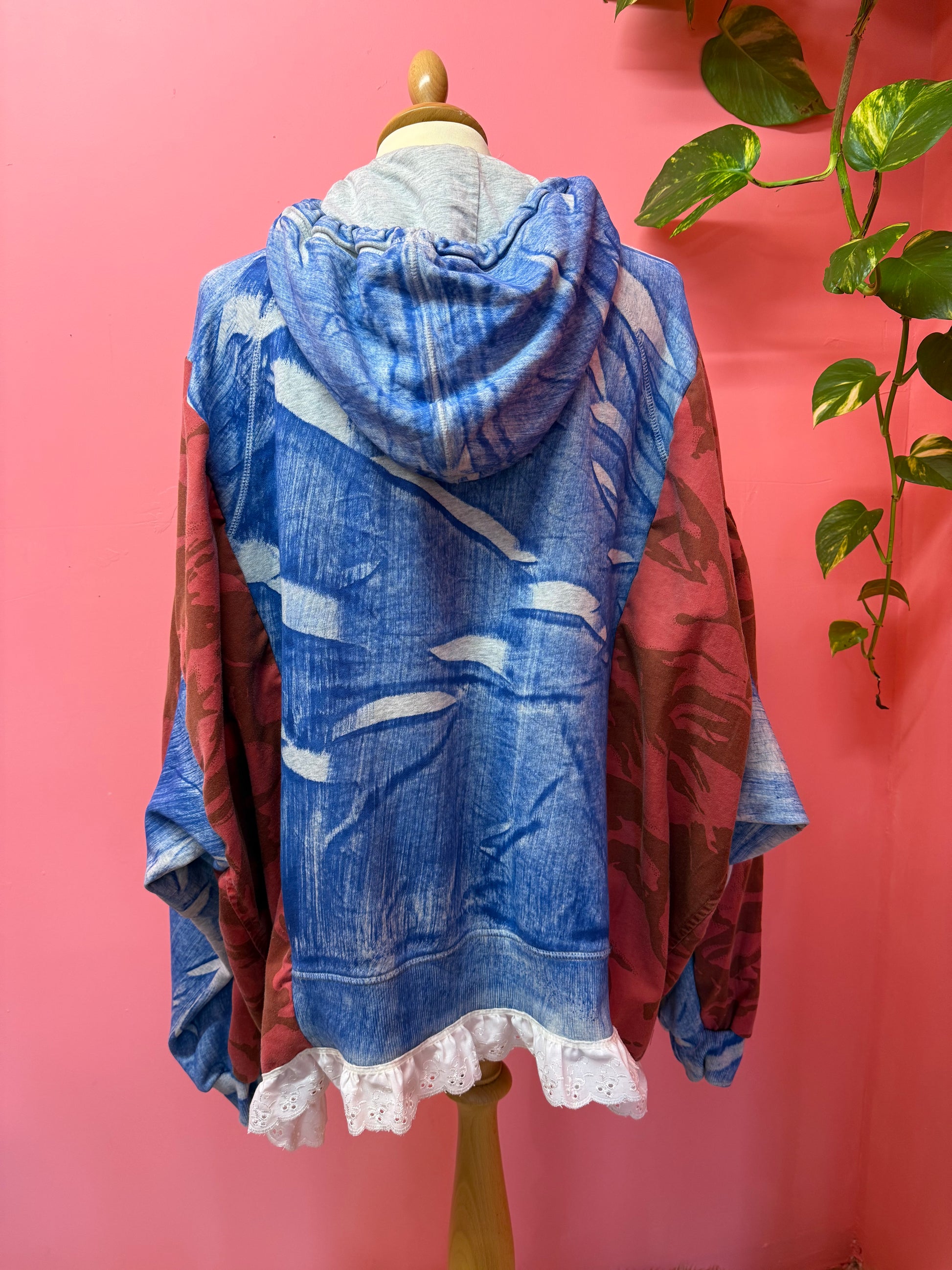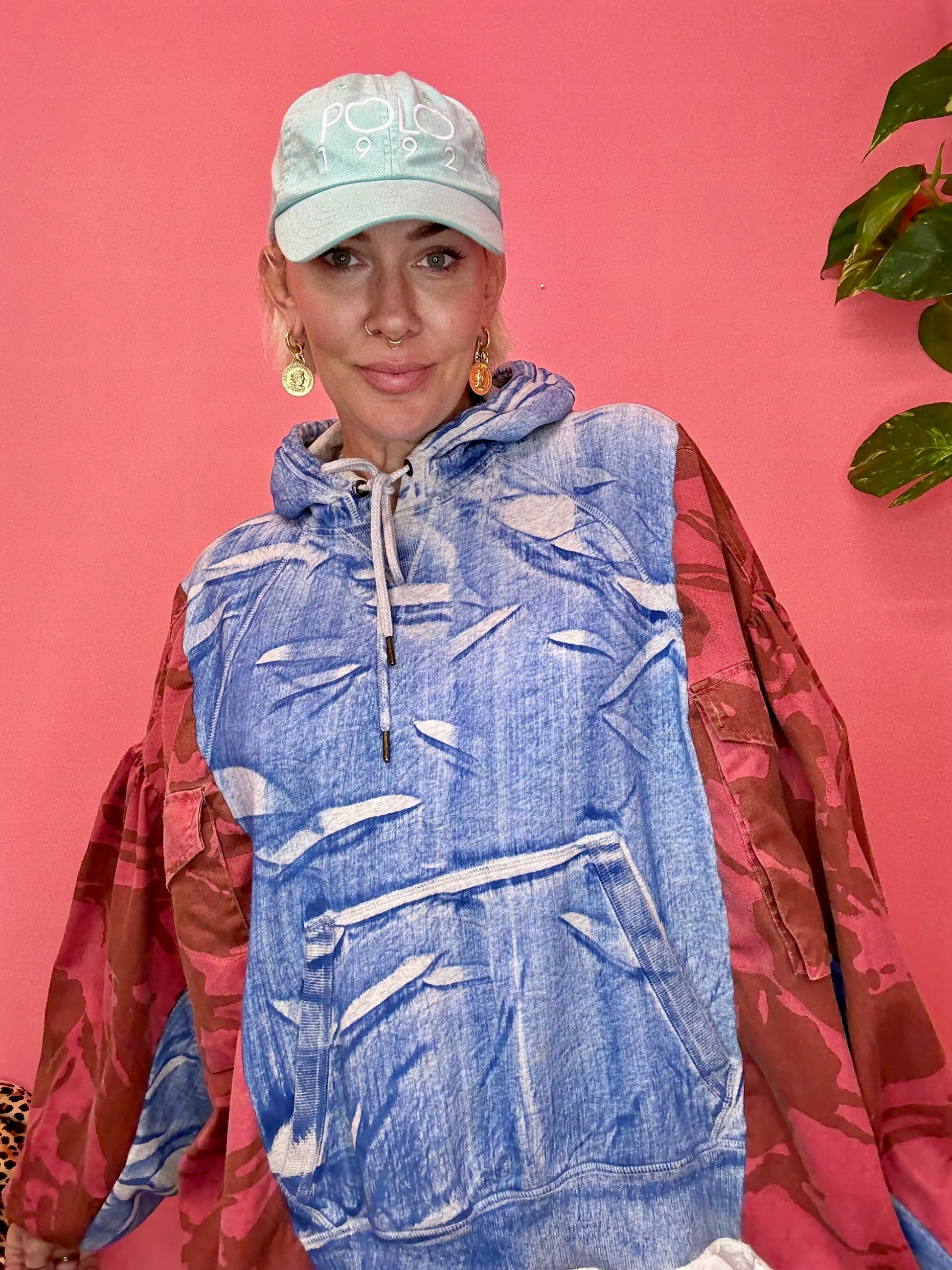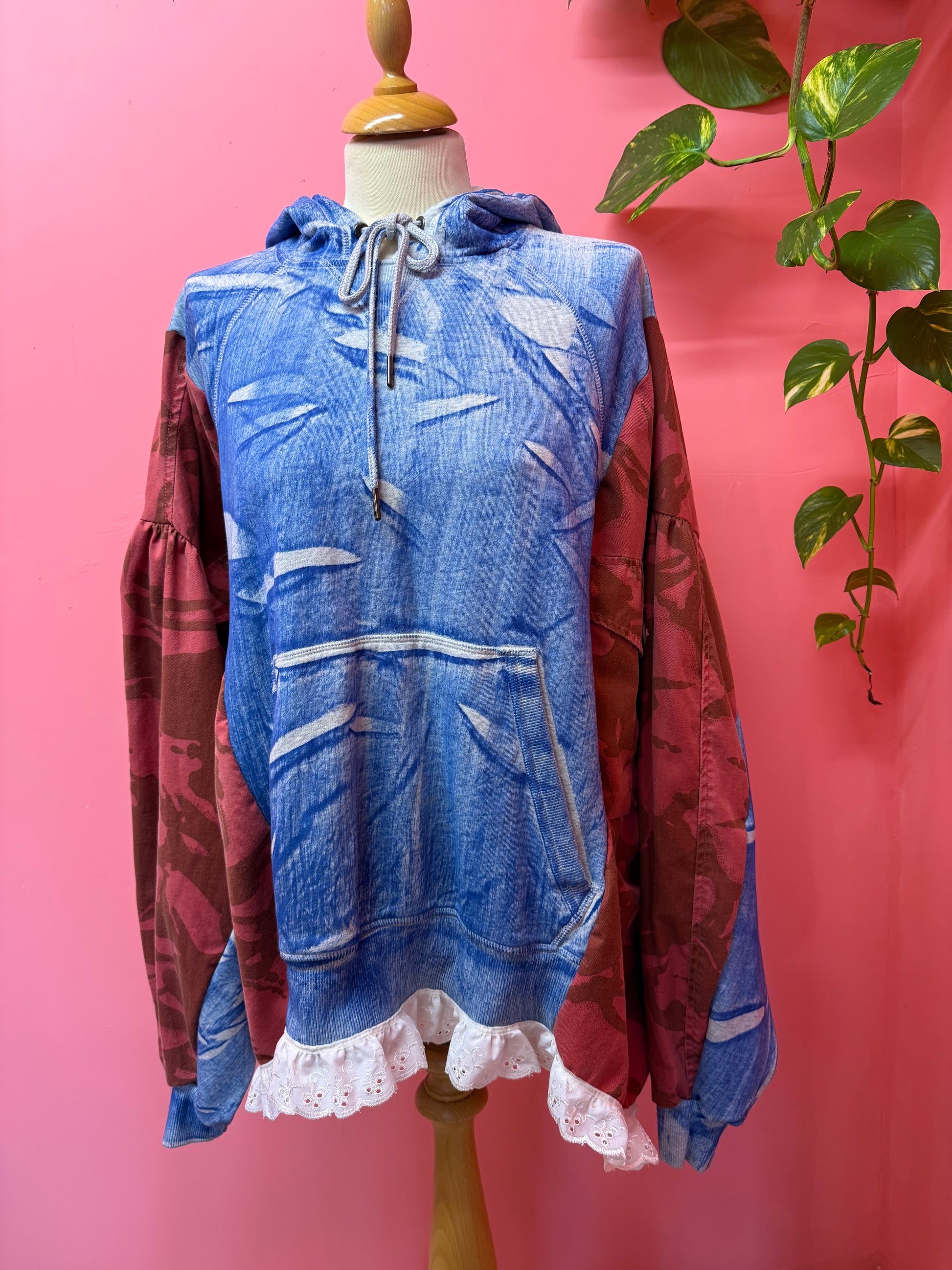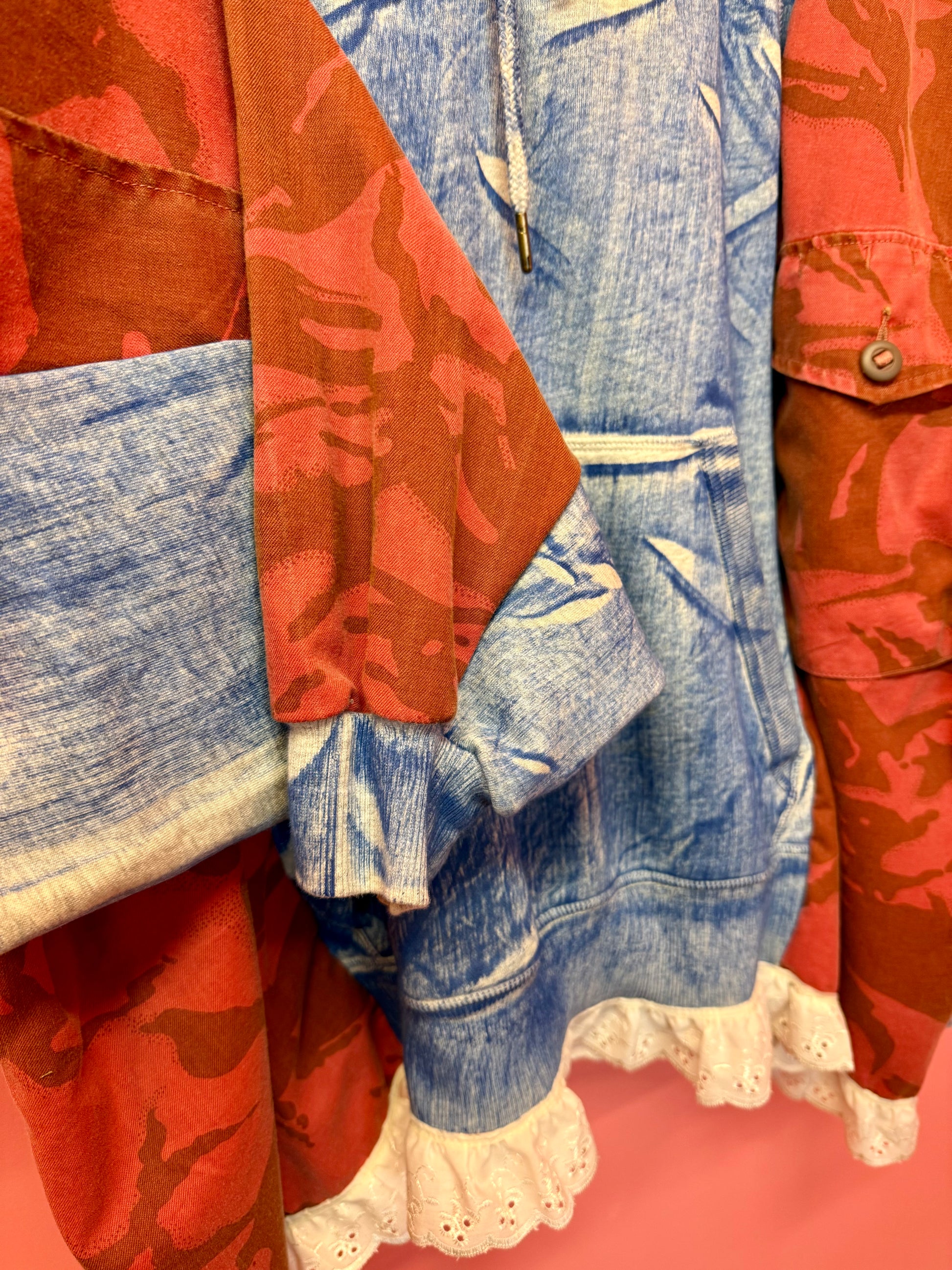 Work & Play is built from vintage workwear and camo jackets — each one completely taken apart, rebuilt, and fused with soft vintage sweatshirt fabric to create those signature balloon arms and gathered puff shoulders.