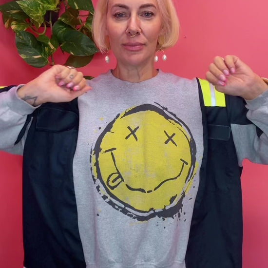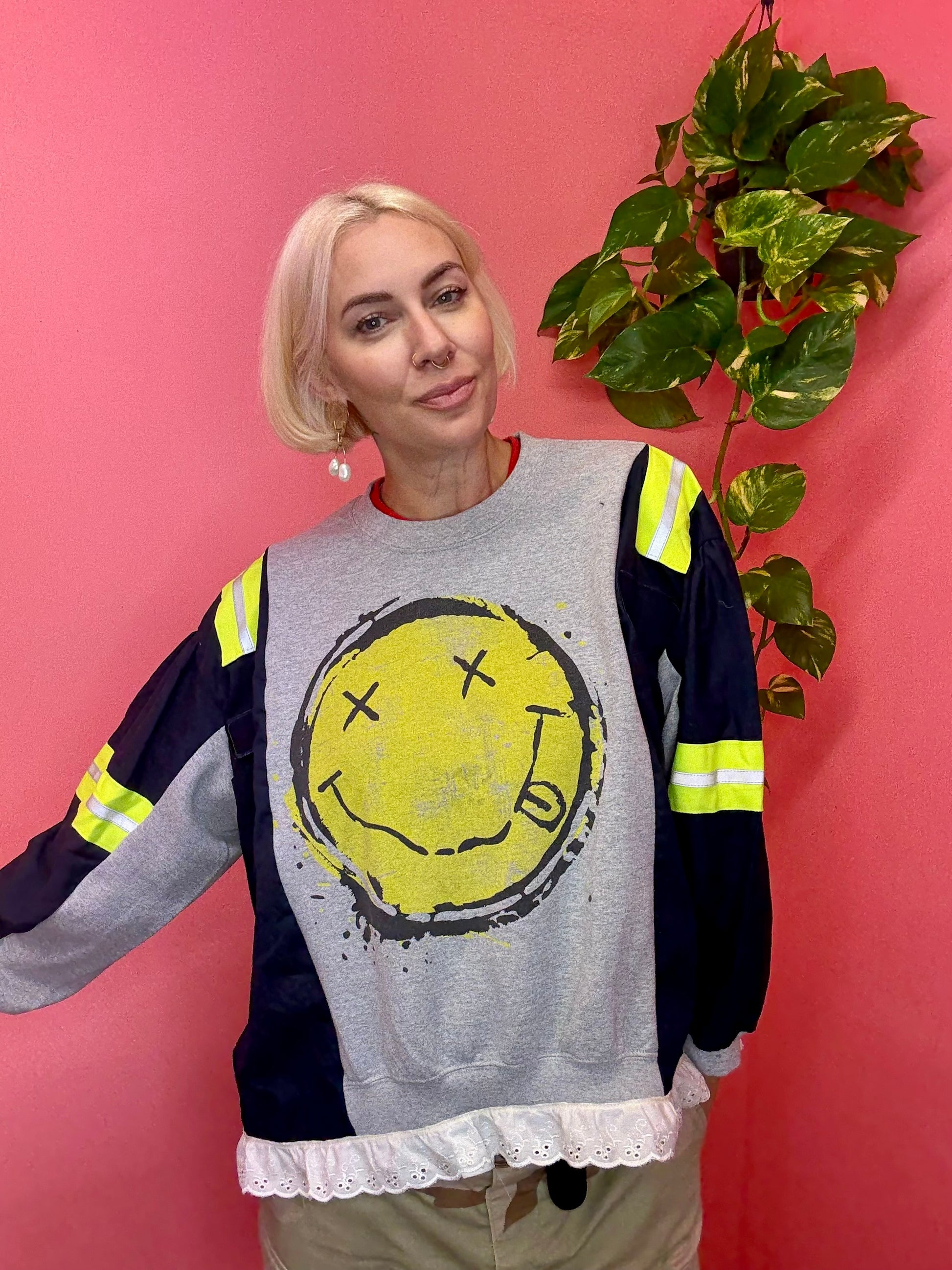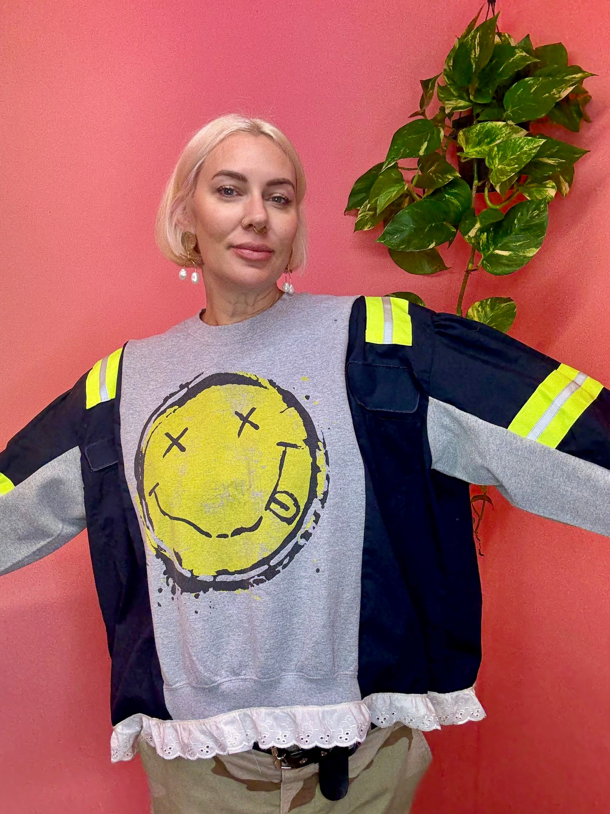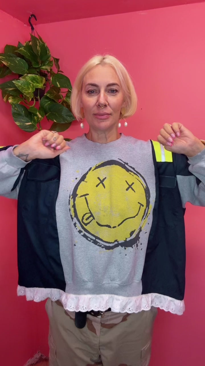 Work & Play is built from vintage workwear and camo jackets — each one completely taken apart, rebuilt, and fused with soft vintage sweatshirt fabric to create those signature balloon arms and gathered puff shoulders.